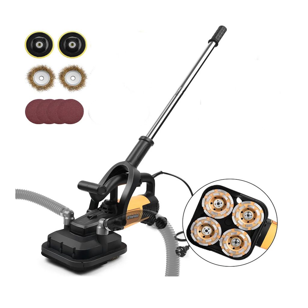 Szlifierka wyposażona w potężny silnik o mocy 3800W, który zapewnia stałą i dużą moc szlifowania aby skutecznie usuwać nierówności, farby, kleje i powłoki z powierzchni betonowych kamień naturalny, twardy tynk i materiały budowlane o niewielkiej lub zerowej wilgotności resztkowej. Urządzenie jest idealne do szlifowania na sucho i szczotkowania różnych powierzchni, takich jak stare drewno, metal, plastik, tynk i inne materiały, niezależnie od tego, czy są pomalowane, czy nie. Cztery jednocześnie działające moduły robocze wyrównują siły odchylające spowodowane obrotem, co ułatwia obsługę. Urządzenie jest wyposażone w 6-stopniową regulację prędkości, aby sprostać wymaganiom różnych materiałów.